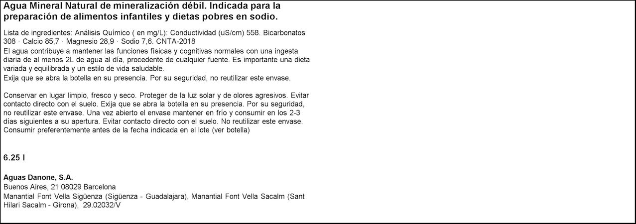 Composición química (mg/l): Residuo seco 287, Bicarbonato (HCO3) 197, Cloruro (Cl) 14, Calcio (Ca) 65, Magnesio (Mg) 14, Sodio (Na) 11